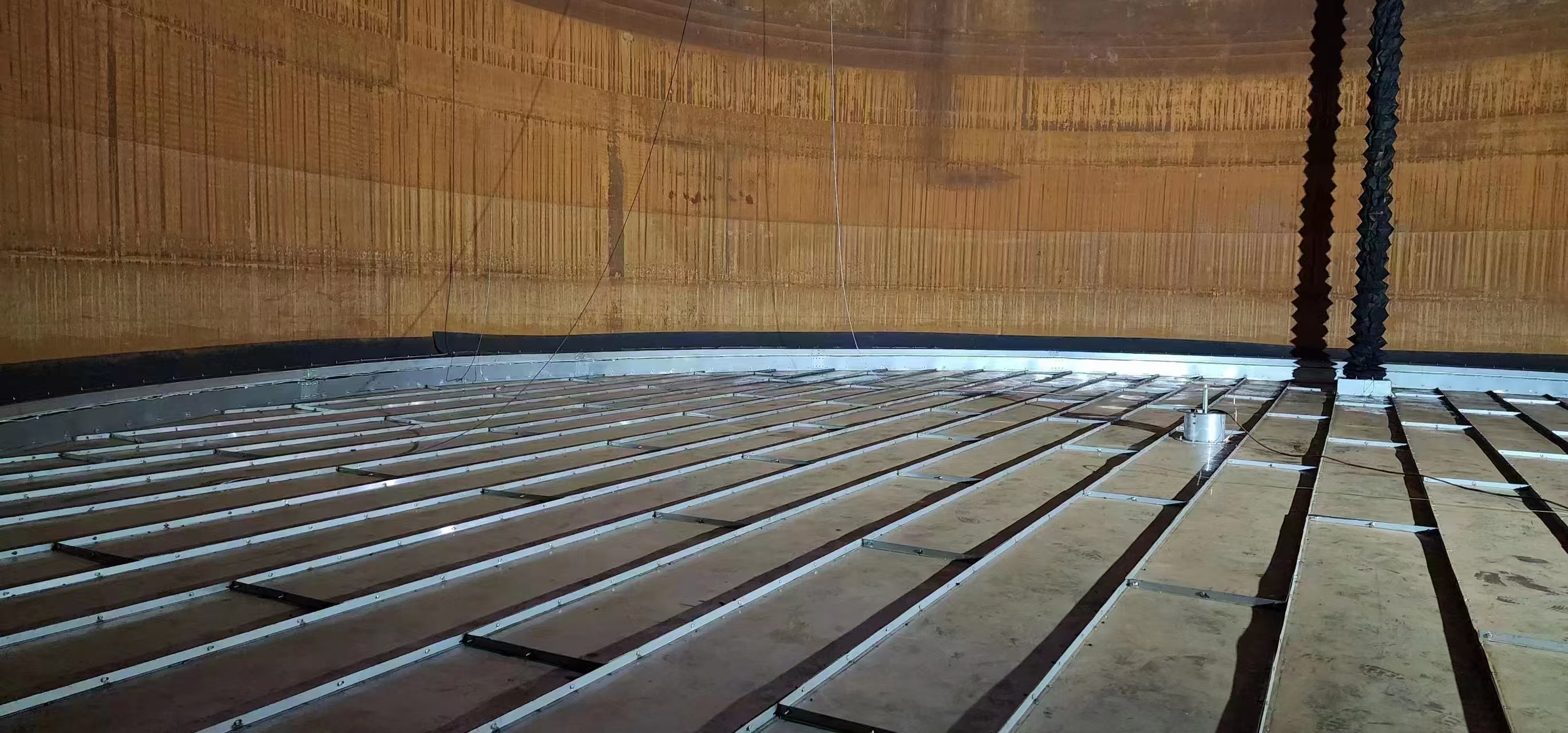 组装式不锈钢内浮盘采用了井字形结构。即浮盘的骨架成井字形;所用材料均为不锈钢材质,增加浮盘的整体结构强度,相应延长了浮盘的使用寿命。